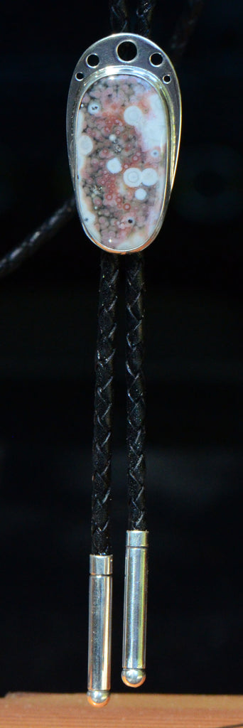 Unique, handmade sterling silver bolo tie featuring an oval orby ocean jasper cabochon. The black leather cord is 37" long with sterling silver cord tips. The bolo face is 24mm X 46mm.